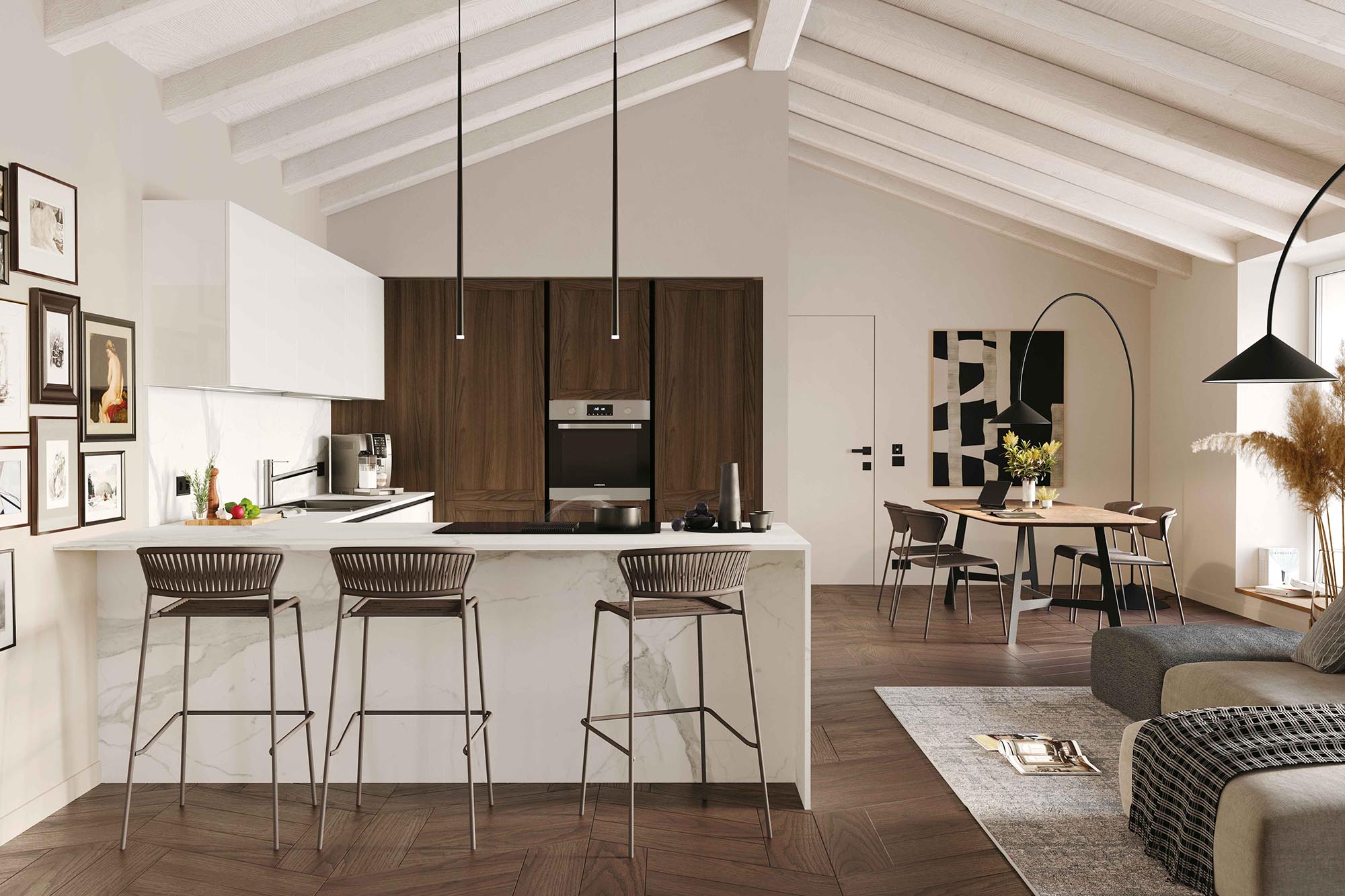 Negli appartamenti di città, dove lo spazio è prezioso, la cucina non è più una stanza chiusa. È parte integrante del soggiorno.