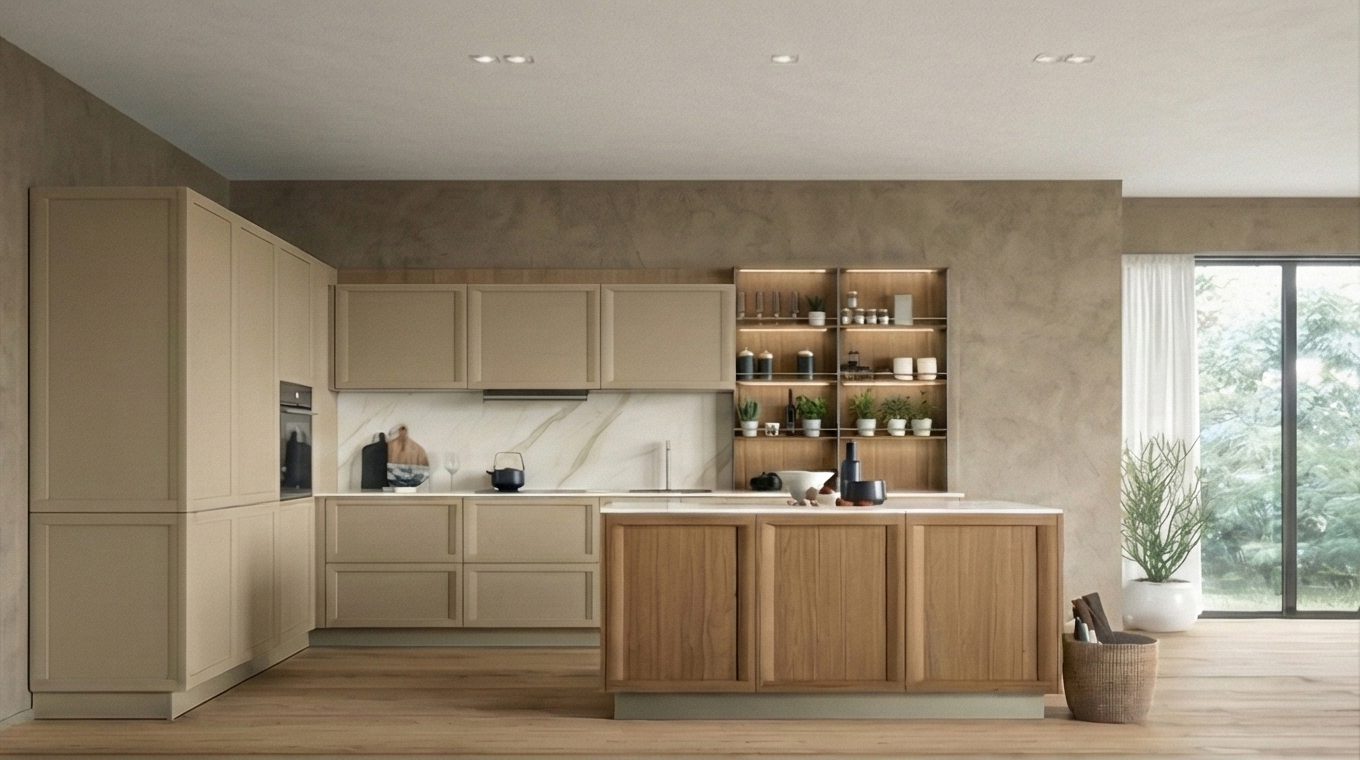 - L’abbinamento vincente: Basi in legno rovere naturale (con nodi a vista) abbinate a pensili laccati opachi in colori neutri.
