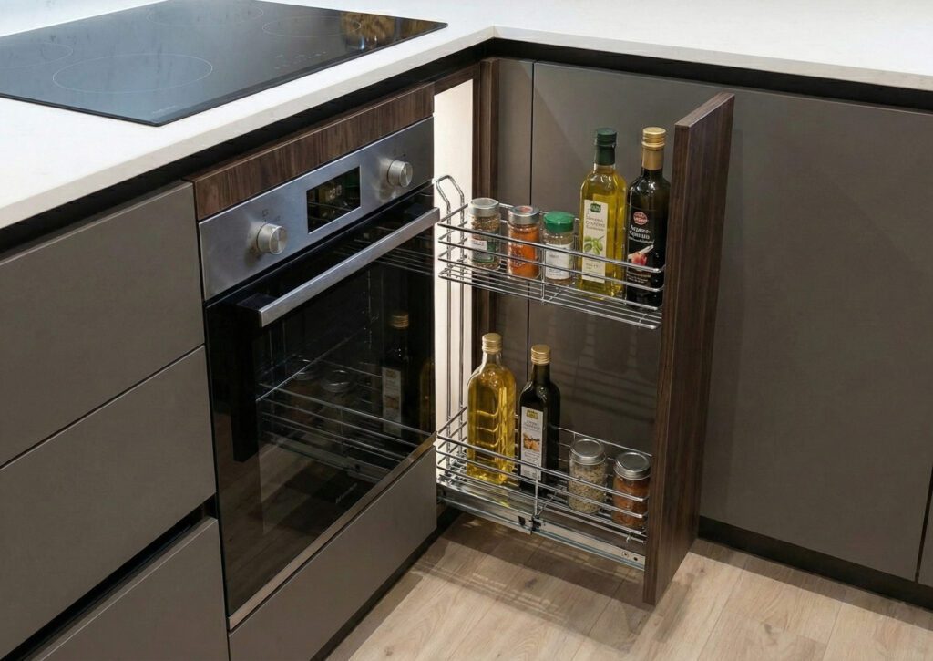 E per gli spazi stretti residui? Usiamo i cestelli estraibili mini (da 15, 20 o 25 cm). Sembrano piccoli, ma sono incredibilmente funzionali per organizzare bottiglie di olio, aceto e barattoli delle spezie, tenendo il piano di lavoro sempre libero.