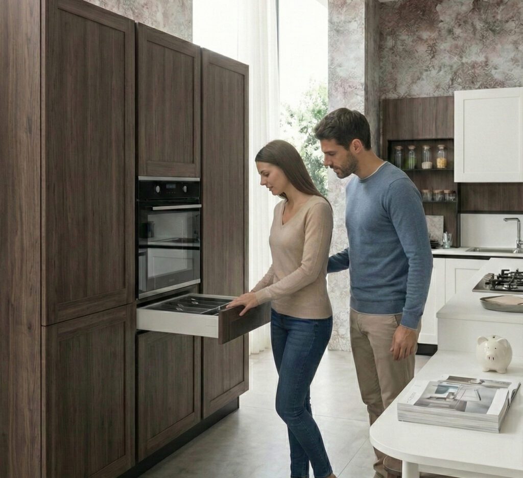 Noi montiamo solo meccaniche di marca (come Blum o Grass). Magari risparmiamo scegliendo un’anta in laminato invece che in vetro, ma la cerniera che la sorregge deve essere eterna. Spendere 100€ in più oggi per guide di qualità ti farà risparmiare centinaia di euro in riparazioni future o, peggio, la necessità di cambiare cucina dopo 5 anni.