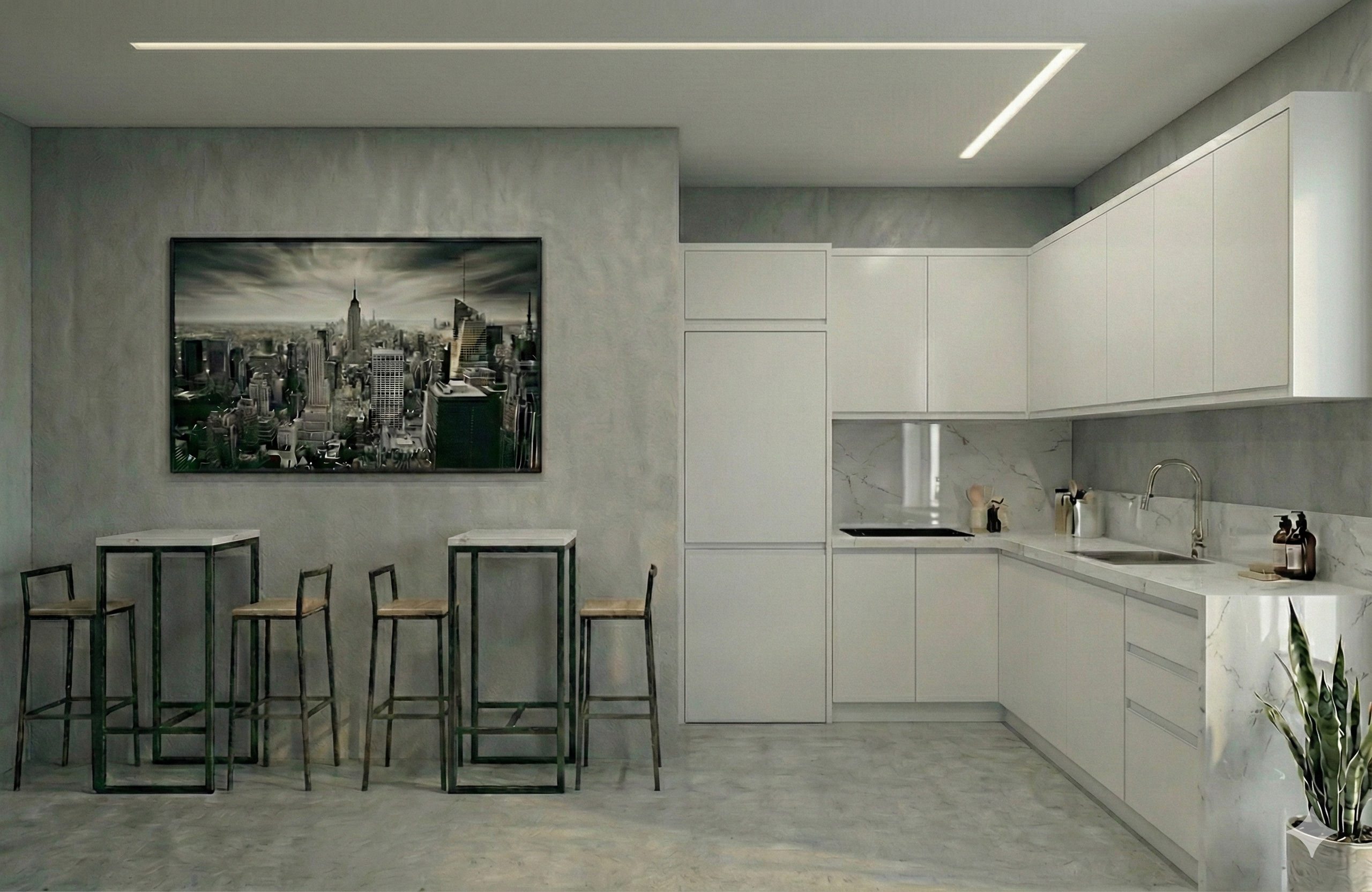 - Lo spazio per la Macchina del Caffè: Sembra banale, ma spesso si progetta la cucina e ci si dimentica che in ufficio c’è quasi sempre una macchina per il caffè a cialde o professionale, che è ingombrante. Prevedi un piano d’appoggio dedicato, con le prese schuko vicine e comodo accesso all’acqua.