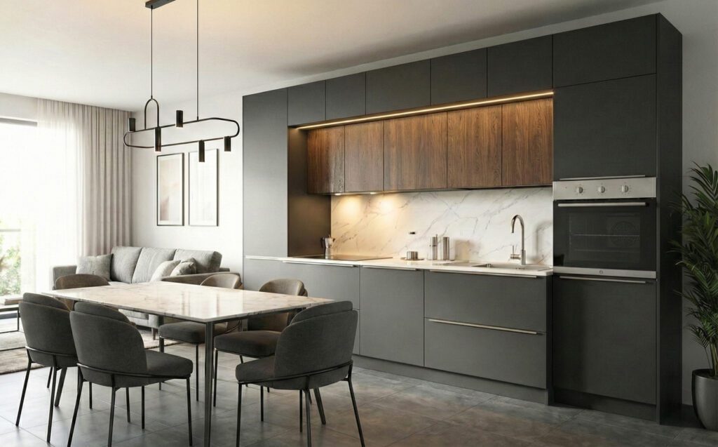 L’errore da non fare mai in una cucina lineare è sbagliare l’ordine. La sequenza corretta deve seguire il processo di cottura: Dispensa/Frigo ➡ Piano d’appoggio ➡ Lavello ➡ Piano di preparazione principale ➡ Cottura.