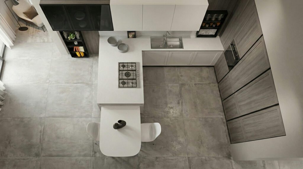 Se questi tre punti sono disposti a casaccio, la cucina diventa una palestra. Tuttavia, il “Triangolo” inteso come forma geometrica rigida è spesso un’ossessione inutile. Ciò che conta non è la forma geometrica, ma il Flusso Operativo.