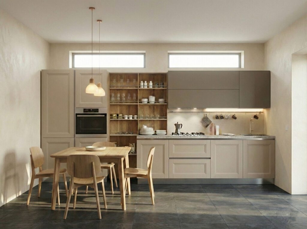 - Vuoi un tocco Moderno/Metropolitano? Prendiamo la stessa anta a telaio, ma togliamo le maniglie usando l’apertura a “gola” e scegliamo colori laccati opachi attuali (come il grigio polvere o il verde bosco). Il risultato è una cucina che dialoga perfettamente con i mattoni a vista della tua taverna, ma con la freschezza del design 2026.