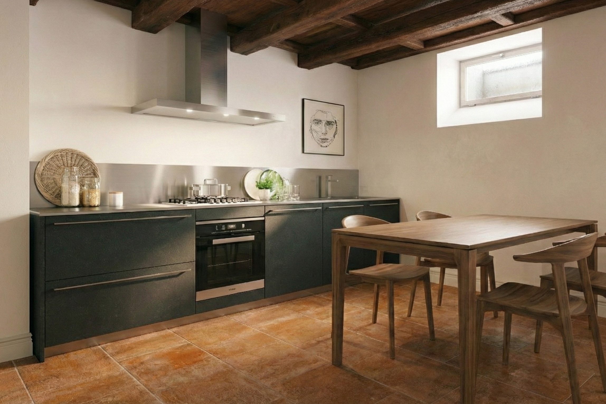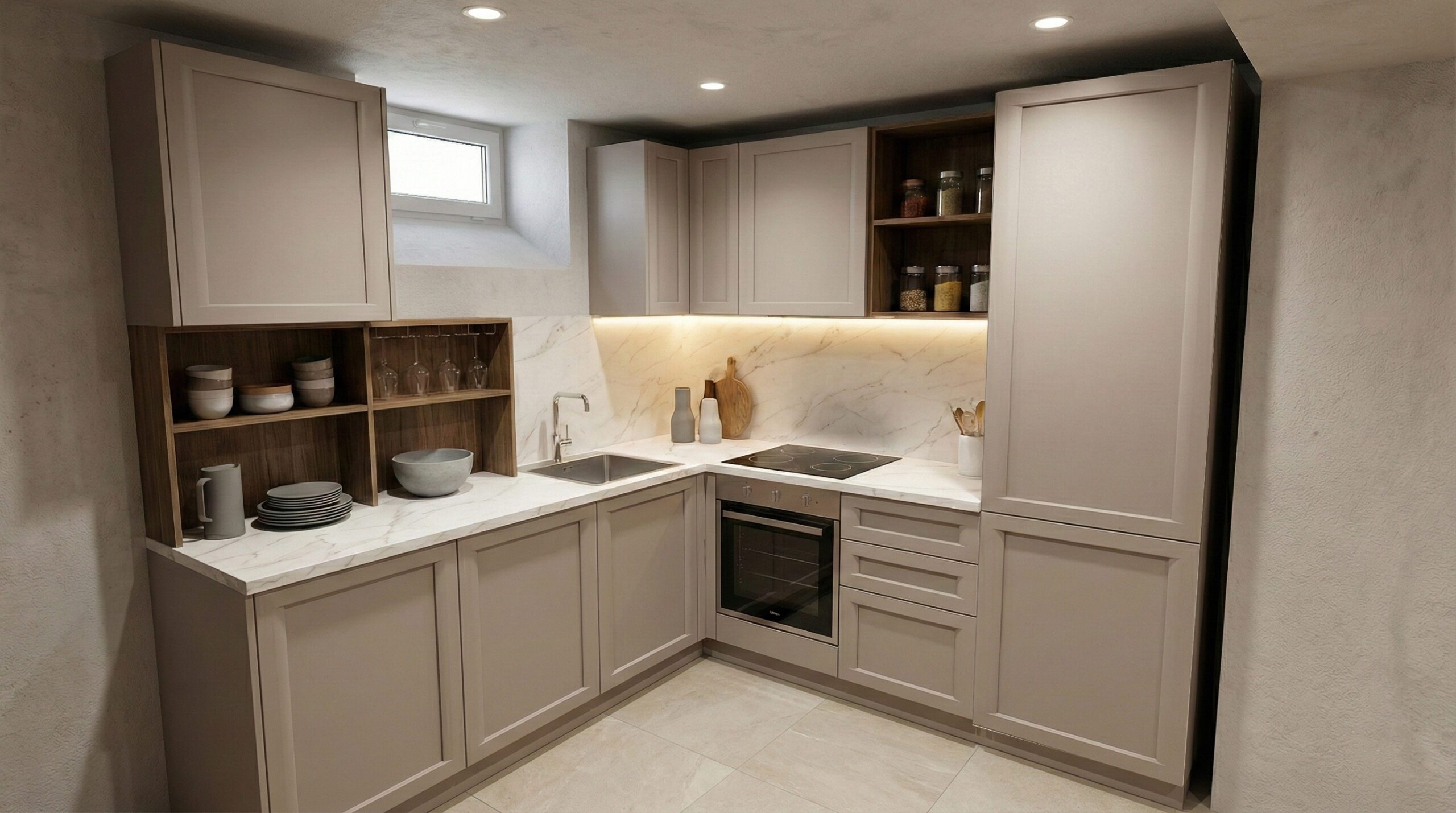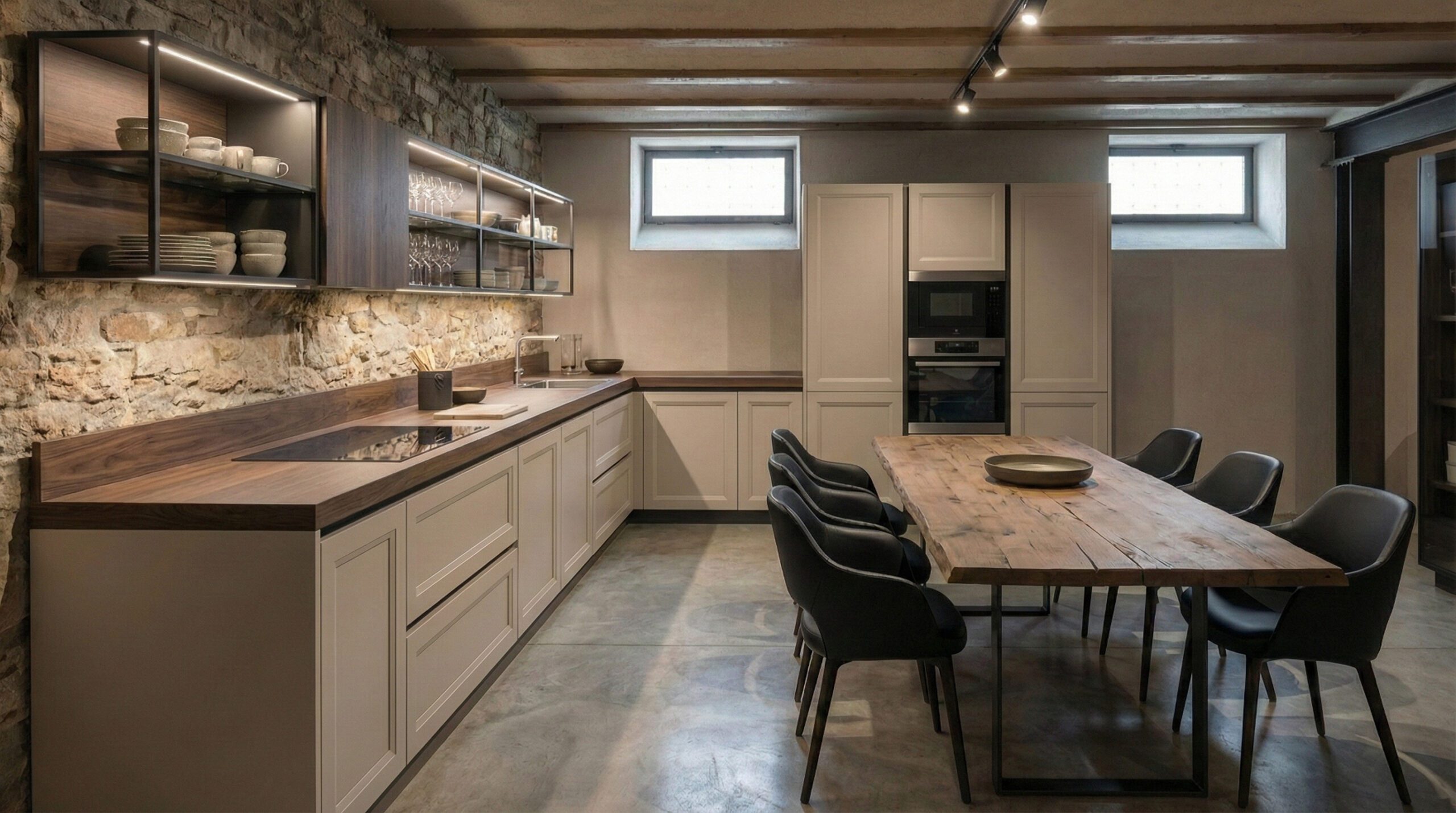 C’è la tendenza a volere la taverna “scura e accogliente”, con legni tinte noce o castagno. Attenzione: i seminterrati hanno finestre piccole (“bocche di lupo”) e poca luce naturale. Mettere una cucina scura rischia di creare l’effetto “caverna” o cantina buia.