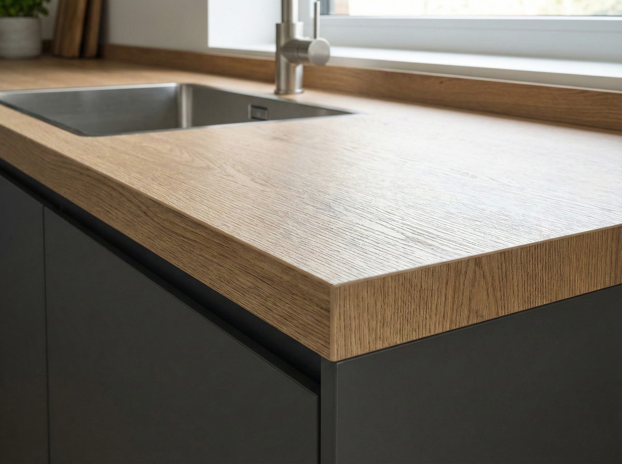 - Laminato Classico: È la soluzione più economica. Offre infinite finiture (effetto legno, pietra, cemento). È resistente agli urti e facile da pulire, ma soffre il calore eccessivo e i ristagni d’acqua nelle giunture.